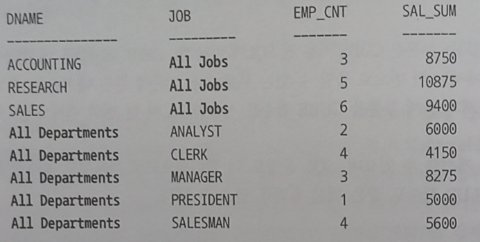 SELECT B.DNAME ,A.JOB ,COUNT(*) AS EMP_CNT ,SUM(A.SAL) AS SAL_SUM FROM EMP A, DEPT B WHERE B.DEPTNO=A.DEPTNO GROUP BY B.DNAME,A.JOB ORDER BY B.DNAME,A.JOB;2. ROLLUP 함수 사용