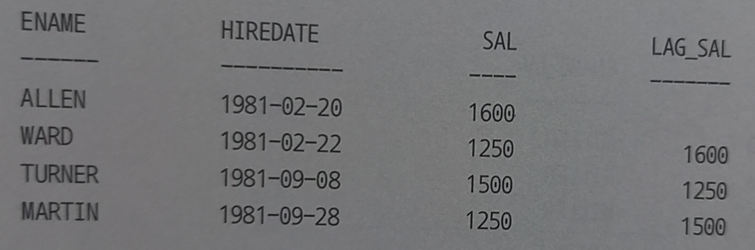 SELECT ENAME, HIREDATE, SAL ,LAG (SAL) OVER (ORDER BY HIREDATE) AS LAG_SAL FROM EMP WHERE JOB='SALEMAN';
