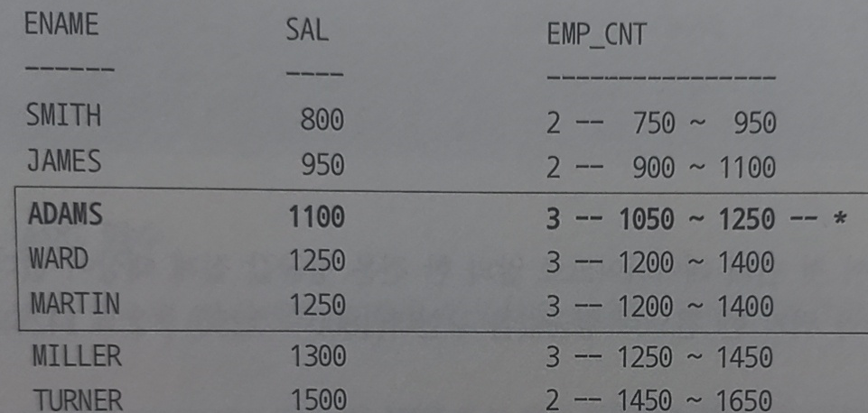 SELECT ENAME, SAL ,COUNT(*) OVER (ORDER BY SAL RANGE BETWEEN 50 PROCEDING AND 150 FOLLOWING) AS EMP_CNT FROM EMP;
