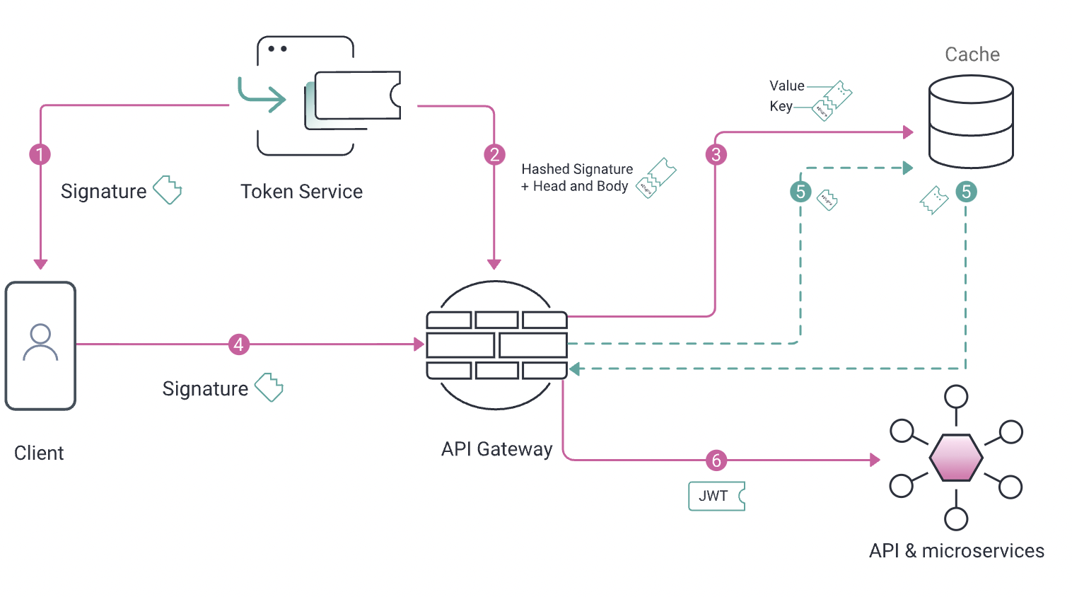 클라이언트가 API를 호출할 때, 서명 부분을 전송합니다. API 게이트웨이는 서명 부분을 해싱하고, 해당 해시를 키로 사용해 캐시에서 일치하는 헤더와 페이로드를 검색합니다. 찾으면 이 부분들을 다시 결합하여 JWT를 생성합니다. 이렇게 JWT를 재구성하기 때문에 권한 부여 서버에 추가적으로 접근할 필요가 없습니다.